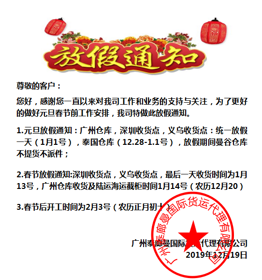 泰廊曼2020年春節放假通知