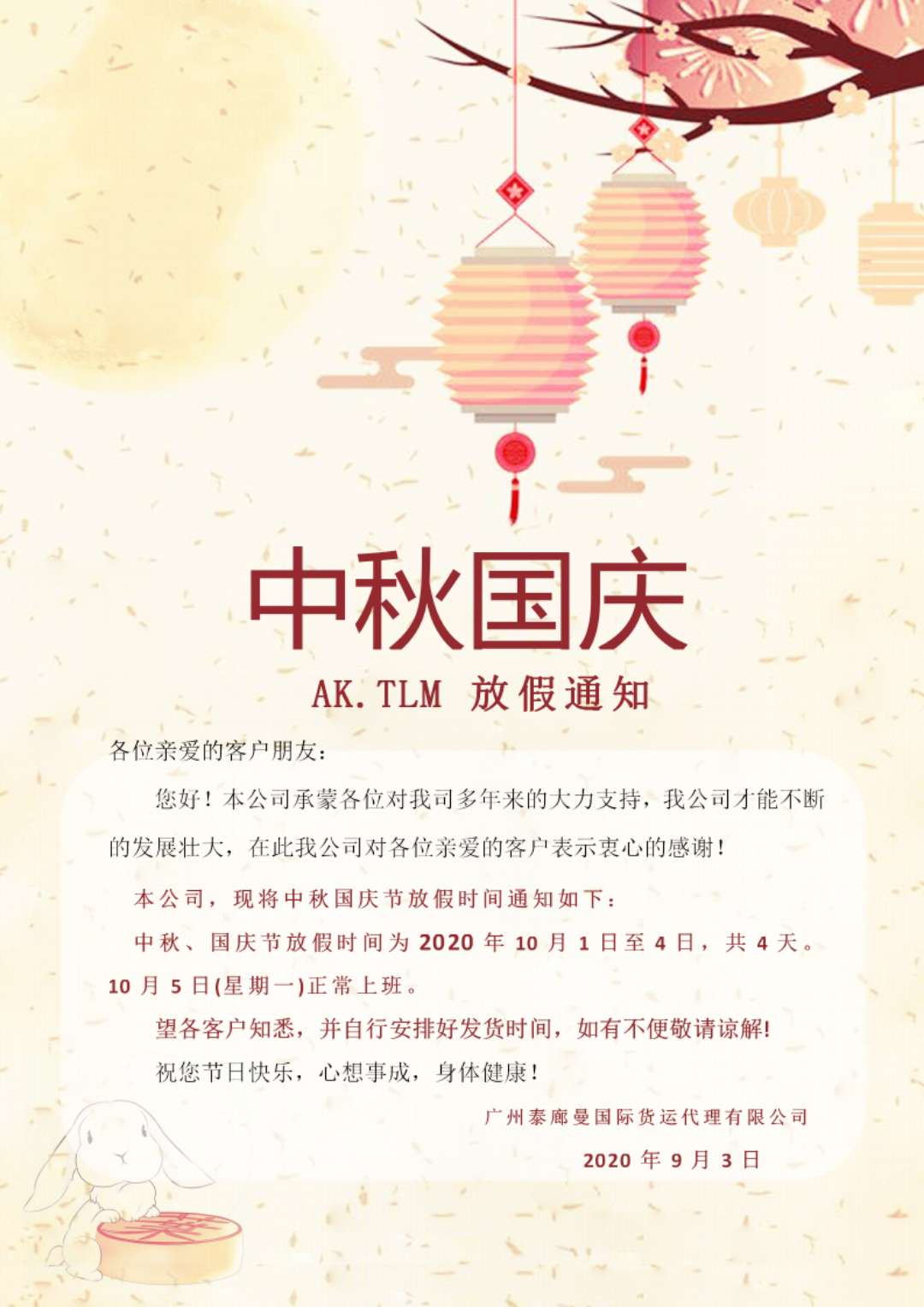 泰廊曼2020年中秋節(jié)放假通知
