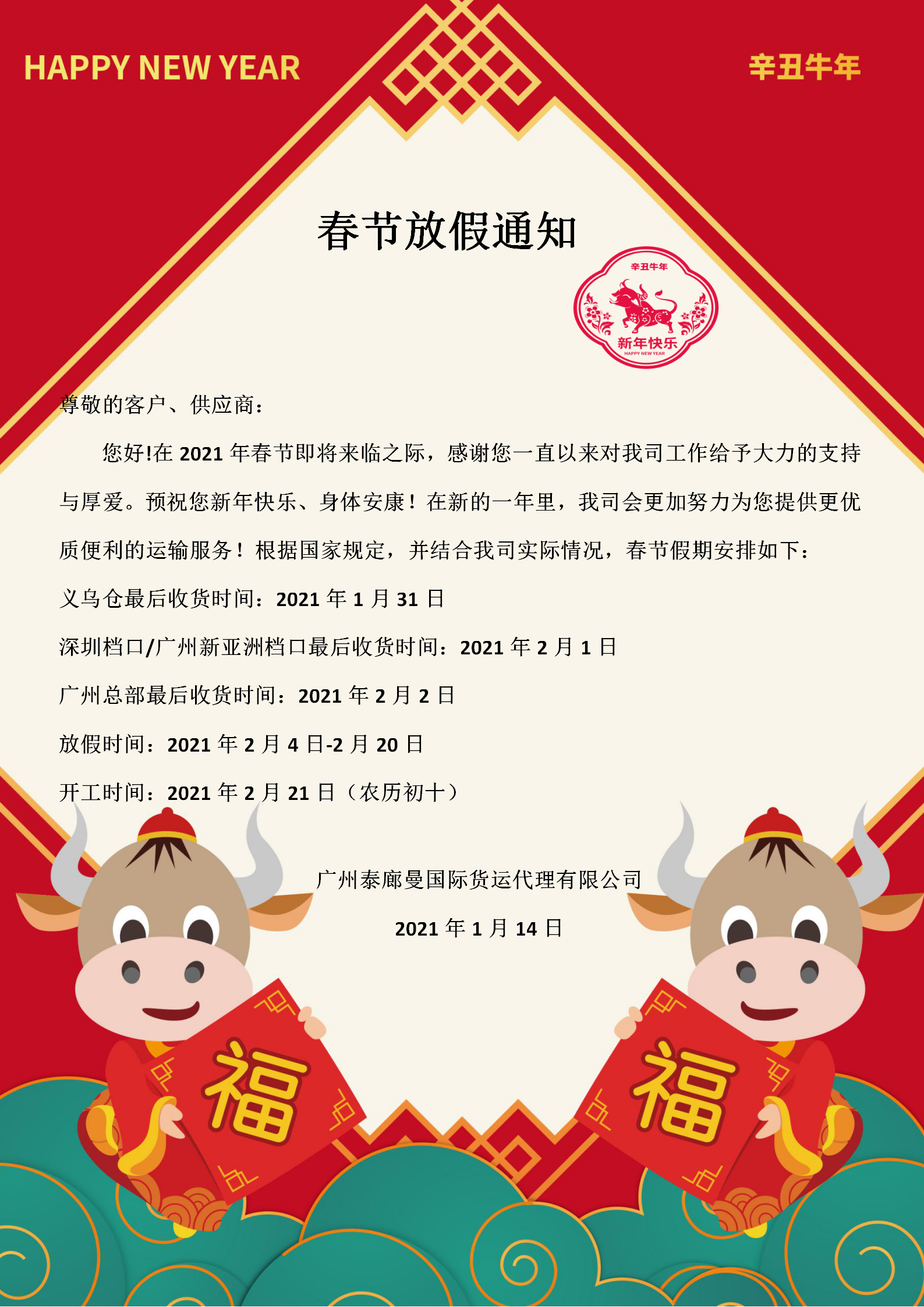 您好!在2021年春節即將來臨之際,感謝您一直以來對我司工作給予大力的支持與厚愛。預祝您新年快樂、身體安康!在新的一年里,我司會更加努力為您提供更優質便利的運輸服務!根據國家規定,并結合我司實際情況,春節假期安排如下: