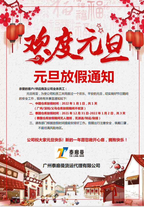 2022年馬上來年,感謝客戶朋友這一年對我公司工作的大力支持配合與理解,元旦期間,我司廣州、深圳、義烏倉庫放假1天,泰國末端曼谷倉庫放假3天,感謝客戶朋友支持和配合,帶來不便請見諒!