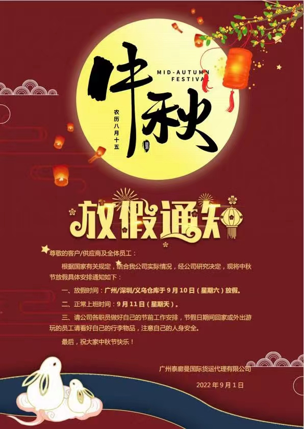 一年一度的中秋佳節(jié),根據(jù)國家有關(guān)規(guī)定,結(jié)合我司實際情況,也為了滿足廣大客戶朋友的出貨安排,經(jīng)公司總經(jīng)辦商討決定中秋放假通知如下: