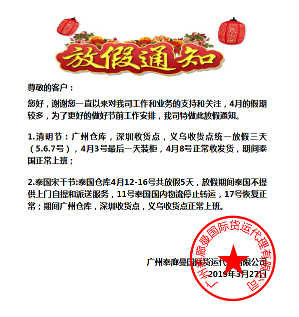 1.清明節:廣州倉庫,深圳收貨點,義烏收貨點統一放假三天(5.6.7號),4月3號最后一天裝柜,4月8號正常收發貨,期間泰國正常上班;